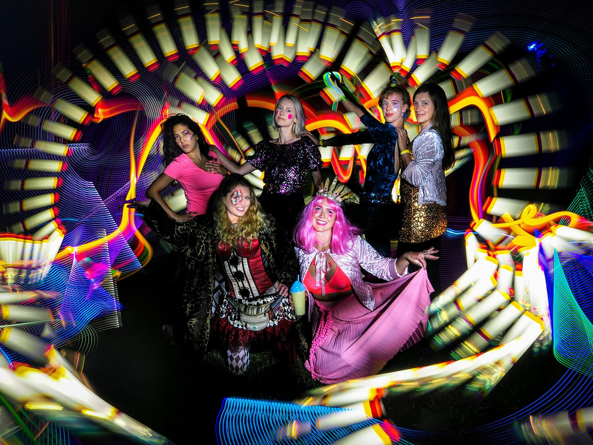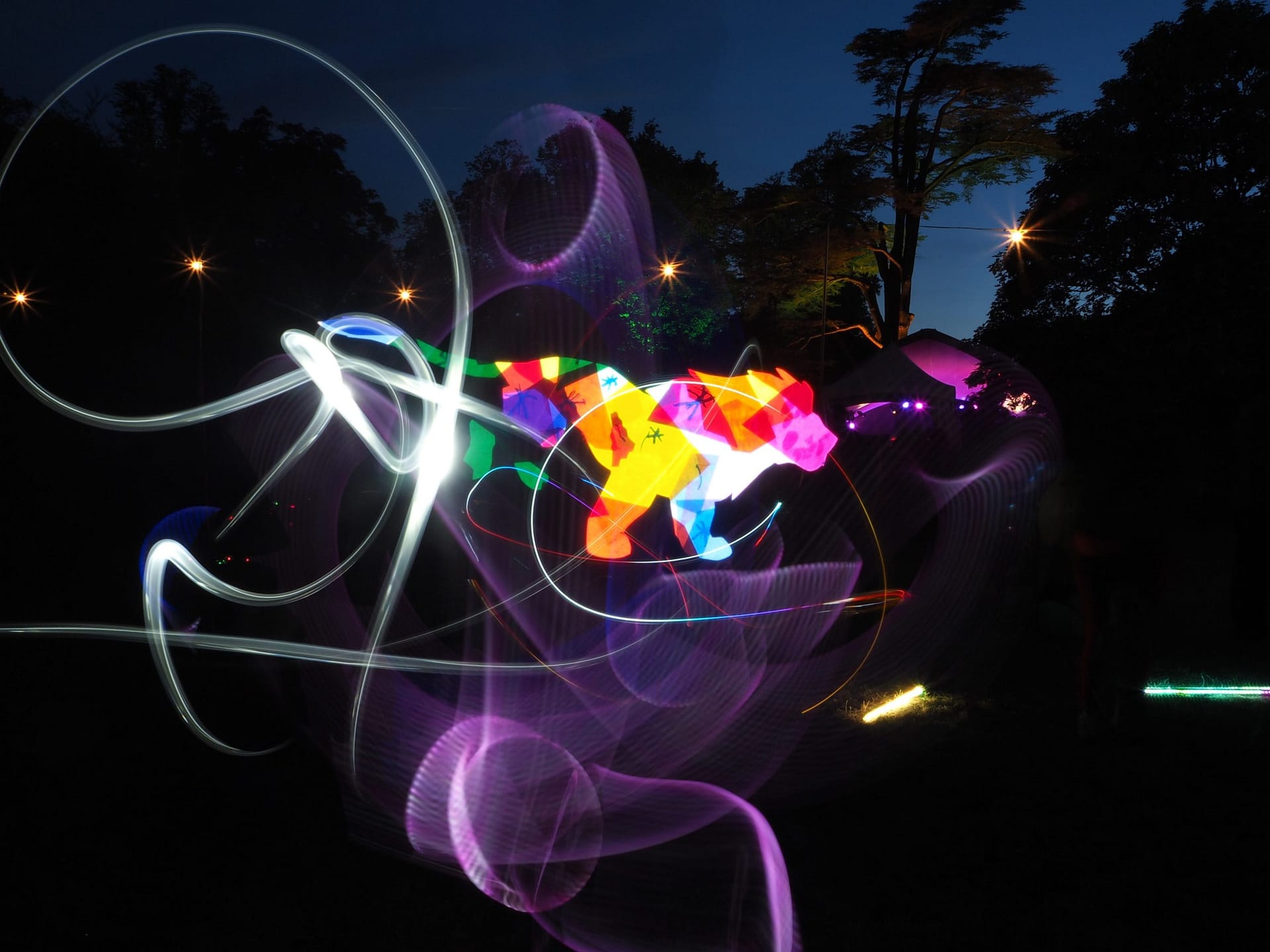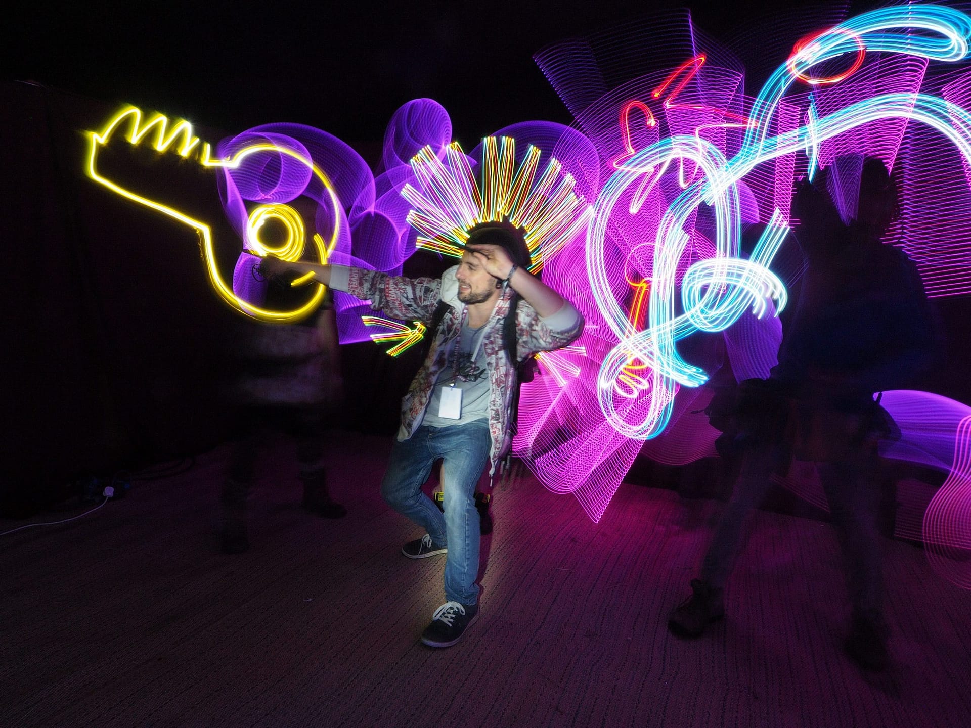 | Wide-eyed amazement is the most common response to participating in light painting workshop! We use a form of long exposure photography similar to making trails with sparklers on Bonfire Night. Participants get to play with an array of homemade light ‘brushes’, torches, lightsabres and wands to create dazzling portraits, abstract masterpieces and amazing animations in a matter of seconds; there are literally infinite possibilities for creativity in this magical process. It is a perfect activity for schools, parties, conferences, festivals, trade shows, weddings and more and works indoors or outside. It works for all ages and abilities and requires no artistic skill – although the artists amongst you will have great fun adapting to this new technique. A single photo can take between 15-60 seconds to create; the process is broadcast to nearby screens in real-time and the final images are instantly viewable at the end of the shot. The process is quite unique in that it requires no booth or black out room and can even work in daytime in a shaded environment. We can set up in a dedicated space or quickly set up in various places around a venue. We also have a 5m x 5m inflatable dome for weather protection or to help dim particularly bright environments. We have run light painting sessions many thousands of participants across the UK and at festivals and events in Paris, Munich, Frankfurt, Malta, Spain and the UAE. |